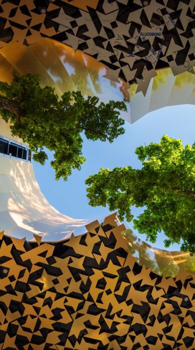 The remarkable structure can be found nestled between the trees in Budapest’s City Park. Its large glass walls are topped with an enormous canopy, studded with holes of varying sizes, allowing light to beam down but also making way for trees to grow up and through.